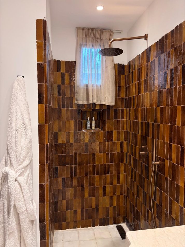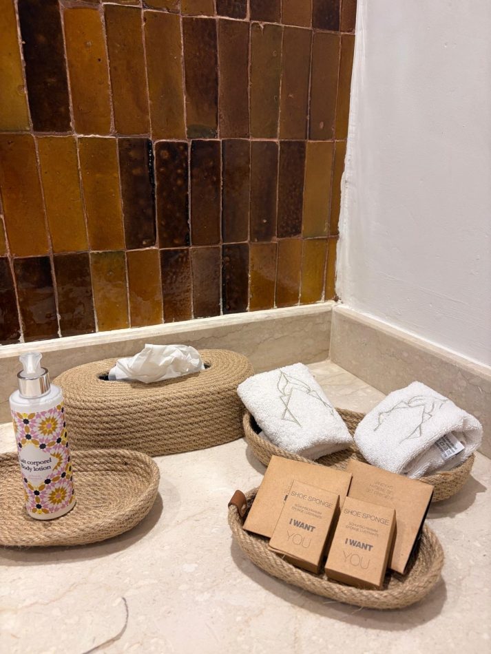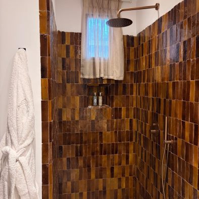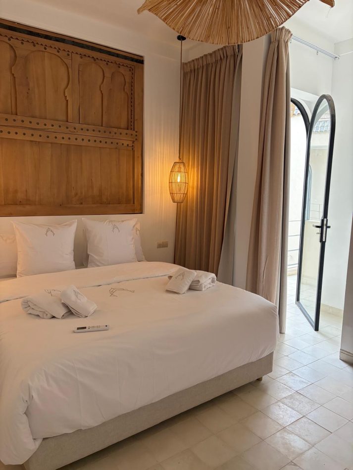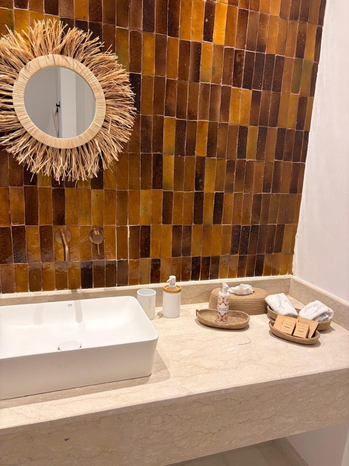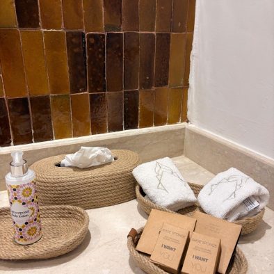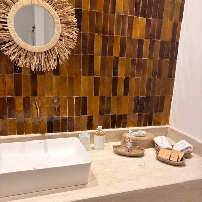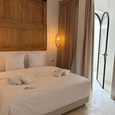 Sous la chaleur douce du zellige couleur cognac, Le Fairway du Palais évoque le charme intemporel des demeures marocaines. Les carreaux de ciment beige et blanc reflètent une lumière apaisante, tandis que la tête de lit, inspirée d’une ancienne porte berbère, raconte l’âme artisanale du Maroc. Les luminaires en raphia diffusent une lueur dorée, comme un coucher de soleil sur les dunes. Une chambre à la fois authentique et élégante, où le passé dialogue subtilement avec le confort contemporain.