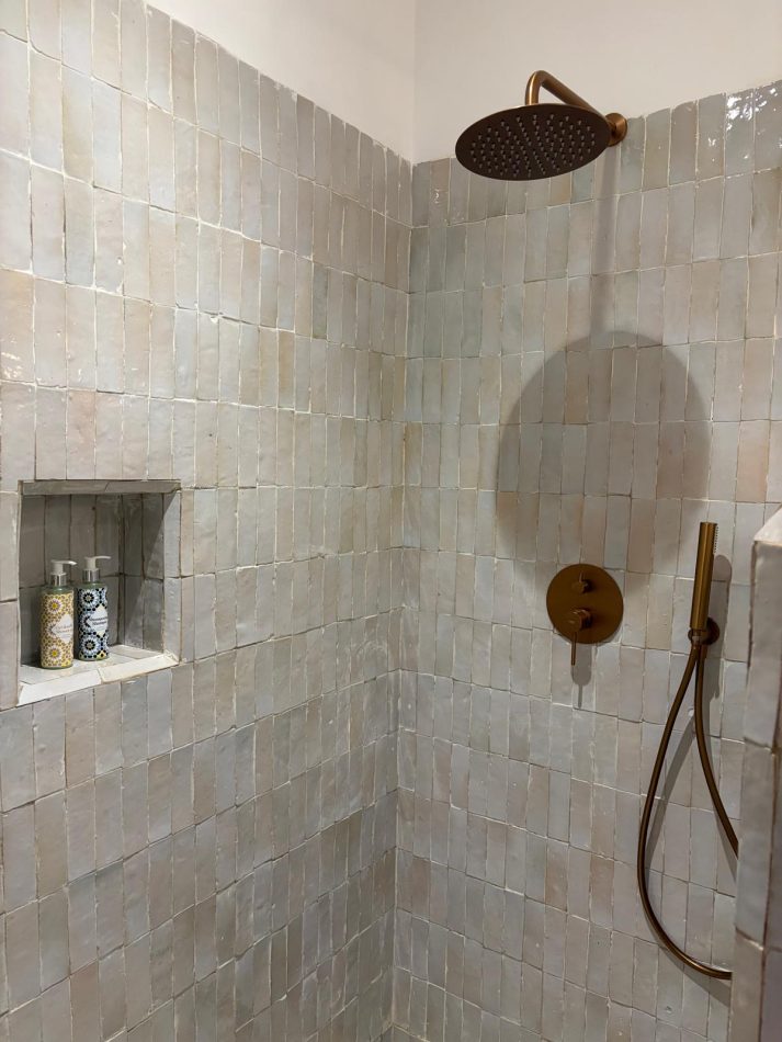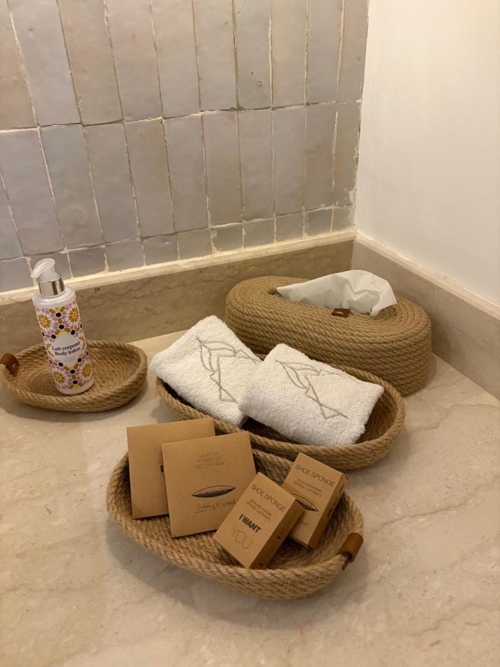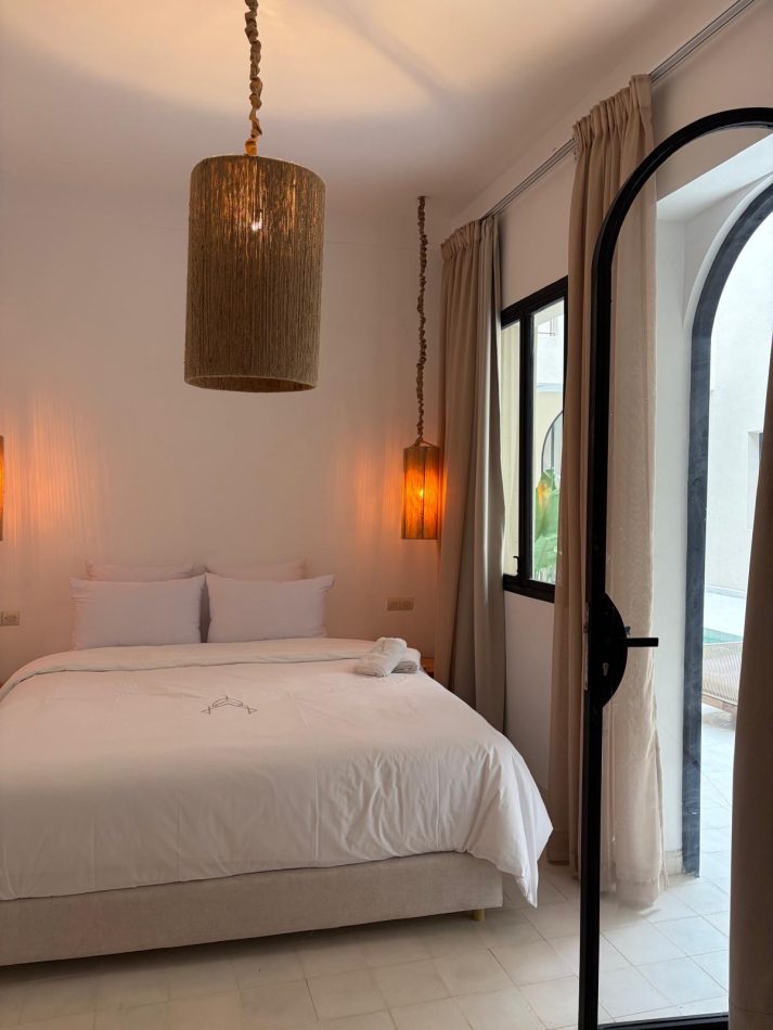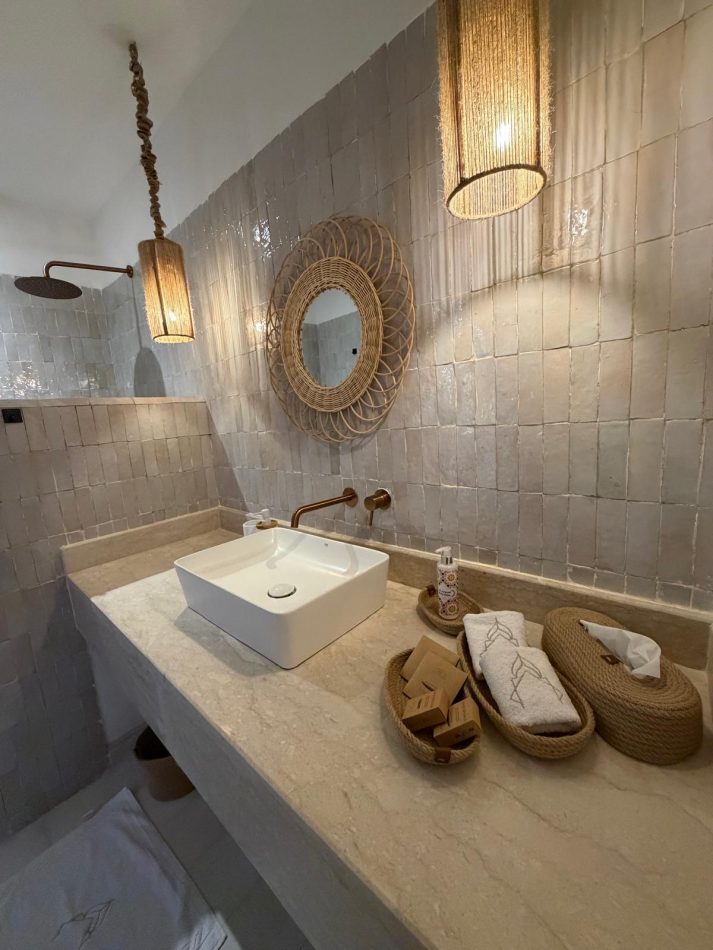 Sobriété et harmonie s’unissent dans cette chambre baignée de douceur. Le tadelakt blanc de la salle de bain reflète la lumière du jour, tandis que les carreaux de ciment aux nuances beige et ivoire apportent une touche artisanale, authentique. Les luminaires en corde diffusent une clarté chaleureuse, invitant à la détente après une journée à explorer Marrakech. Une atmosphère apaisante, simple et raffinée, où chaque détail respire la sérénité de l’Atlas.
